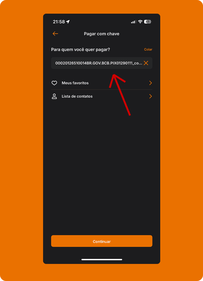 Cole o "Código PIX" e clique em "Continuar" para realizar o pagamento.