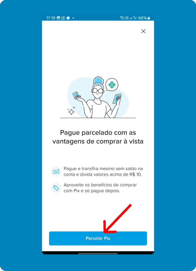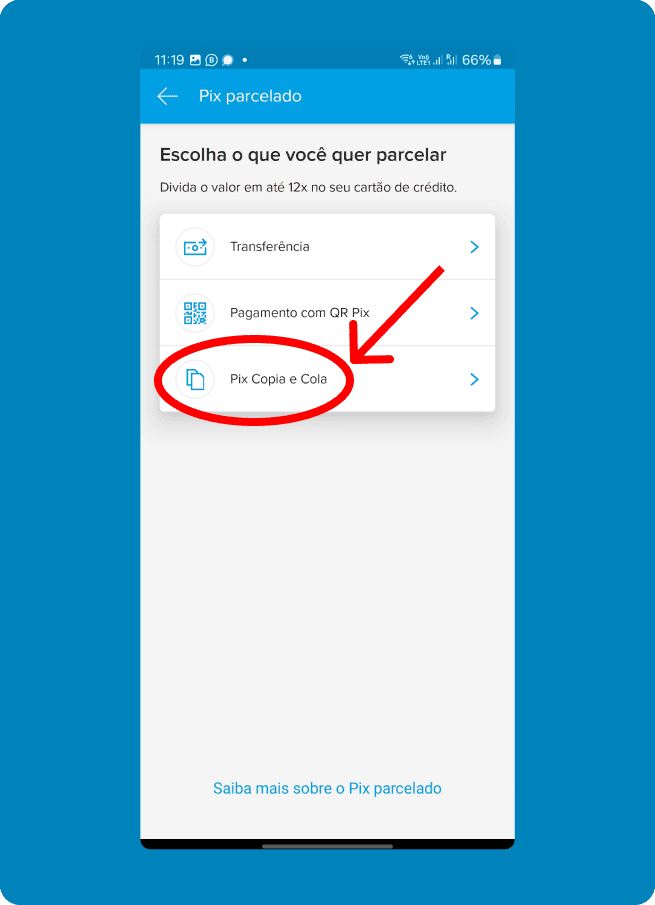 Selecione a opção "PIX Parcelado" para iniciar o pagamento com cartão de crédito.