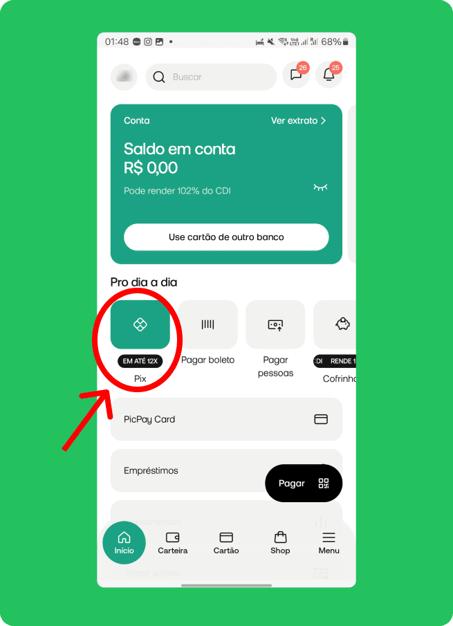 Abra seu aplicativo do PicPay e selecione a opção "PIX".